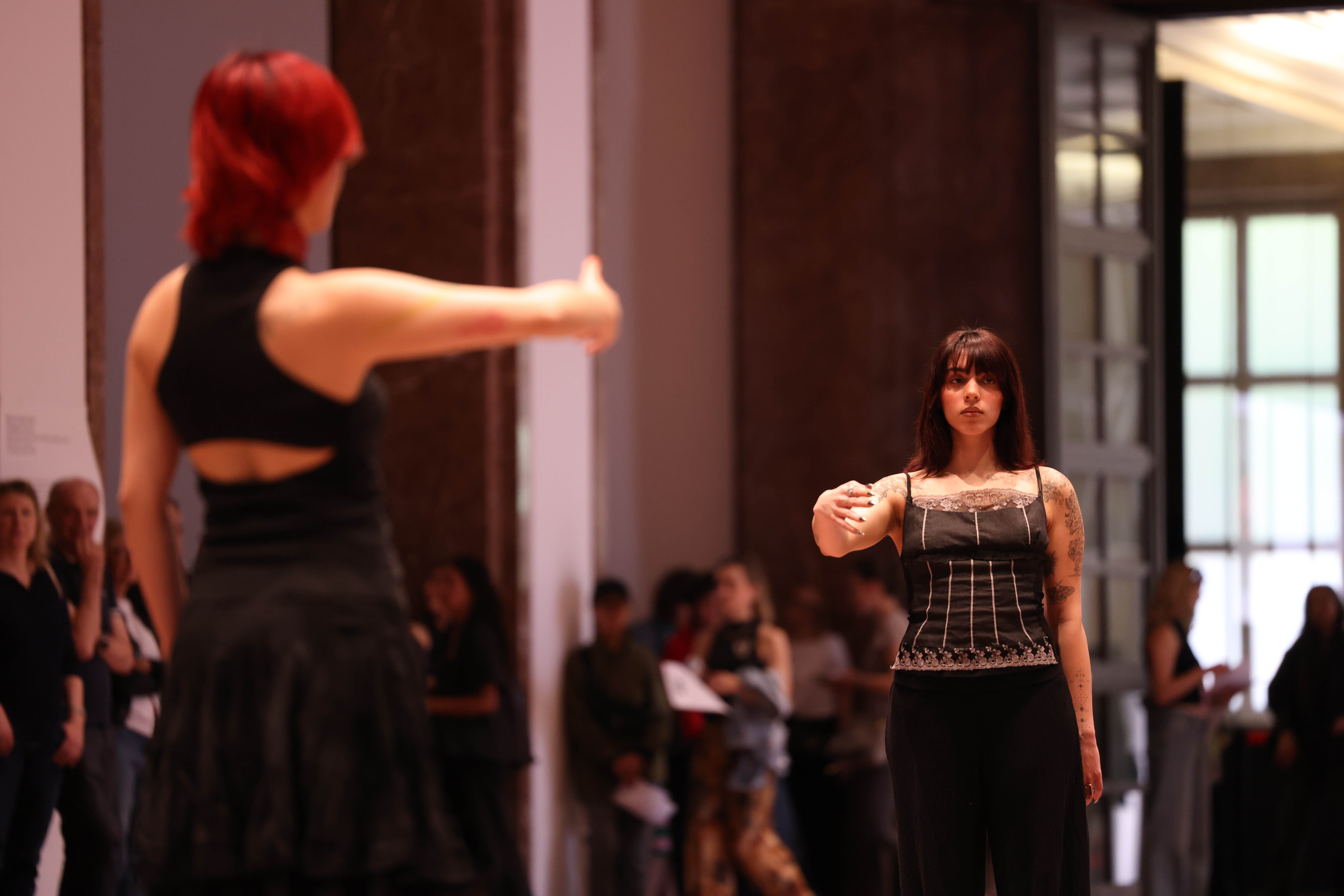 Gestures are fragmented and spatially dispersed, often obscured by architecture. From some angles, performers seem to touch; from others, gaps appear. The choreography plays with illusion and absence—using the space between bodies as a meaningful site. Some movements remain incomplete or only partially visible, becoming choreographic absences: non-actions that invite completion through the viewer’s imagination.