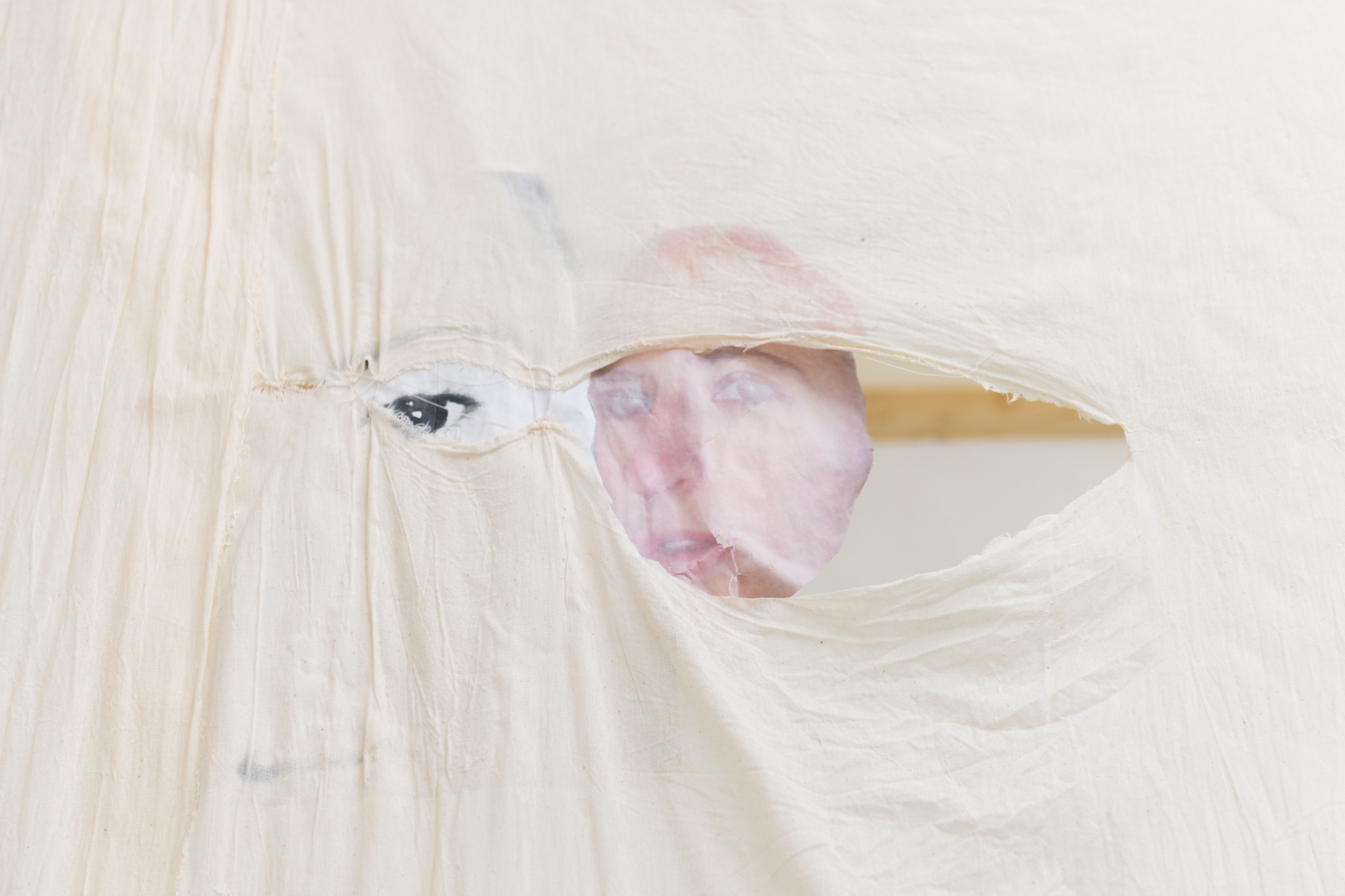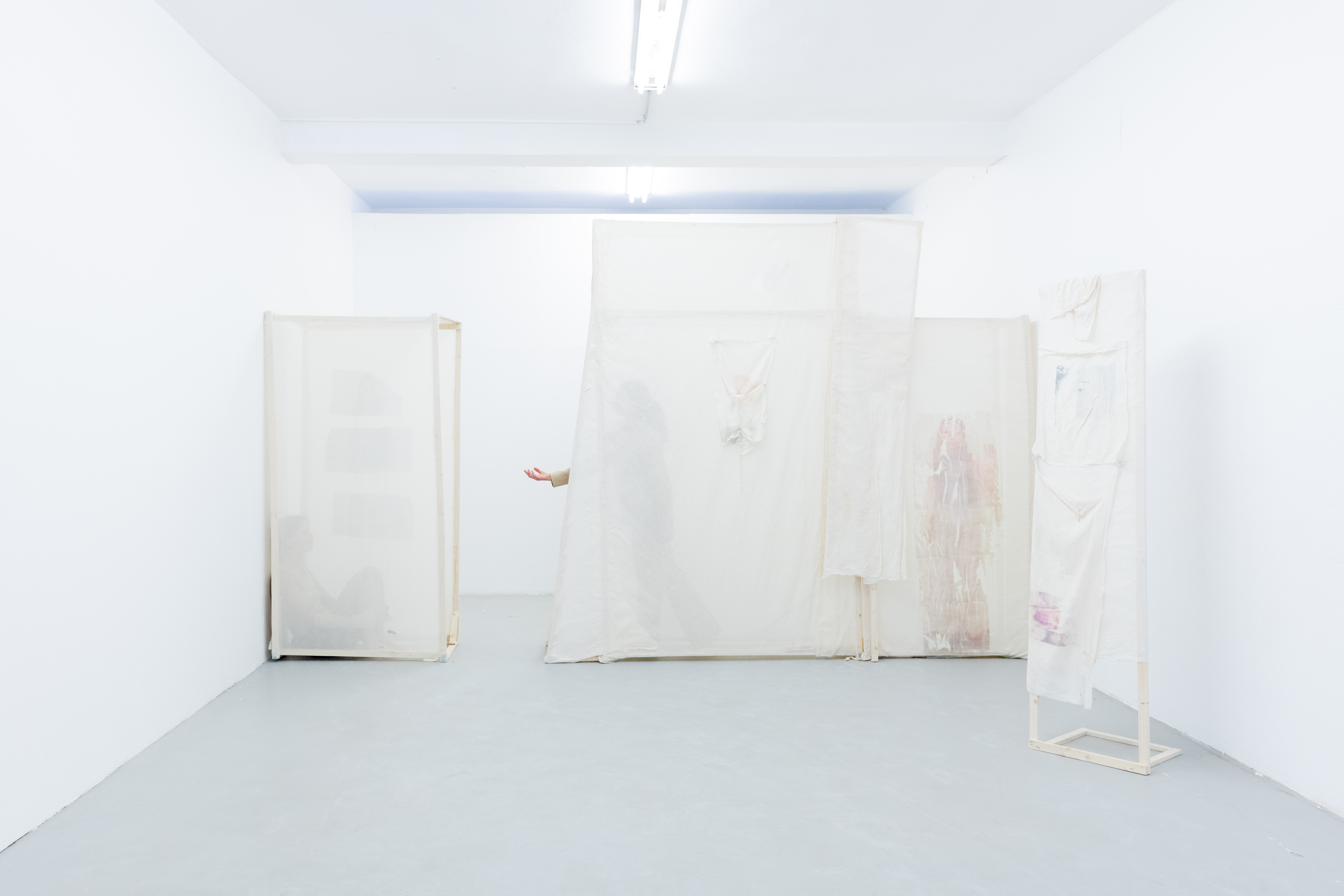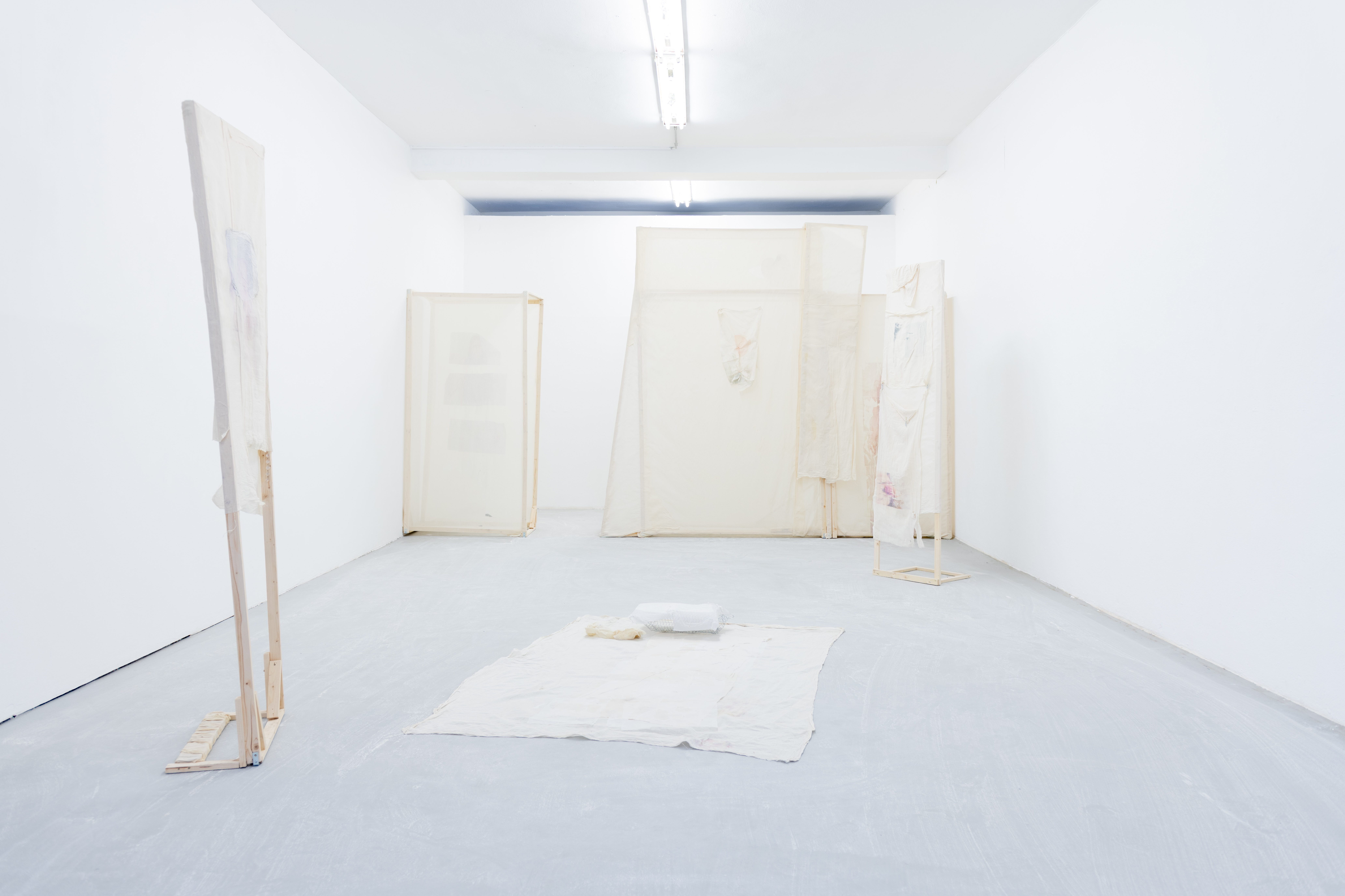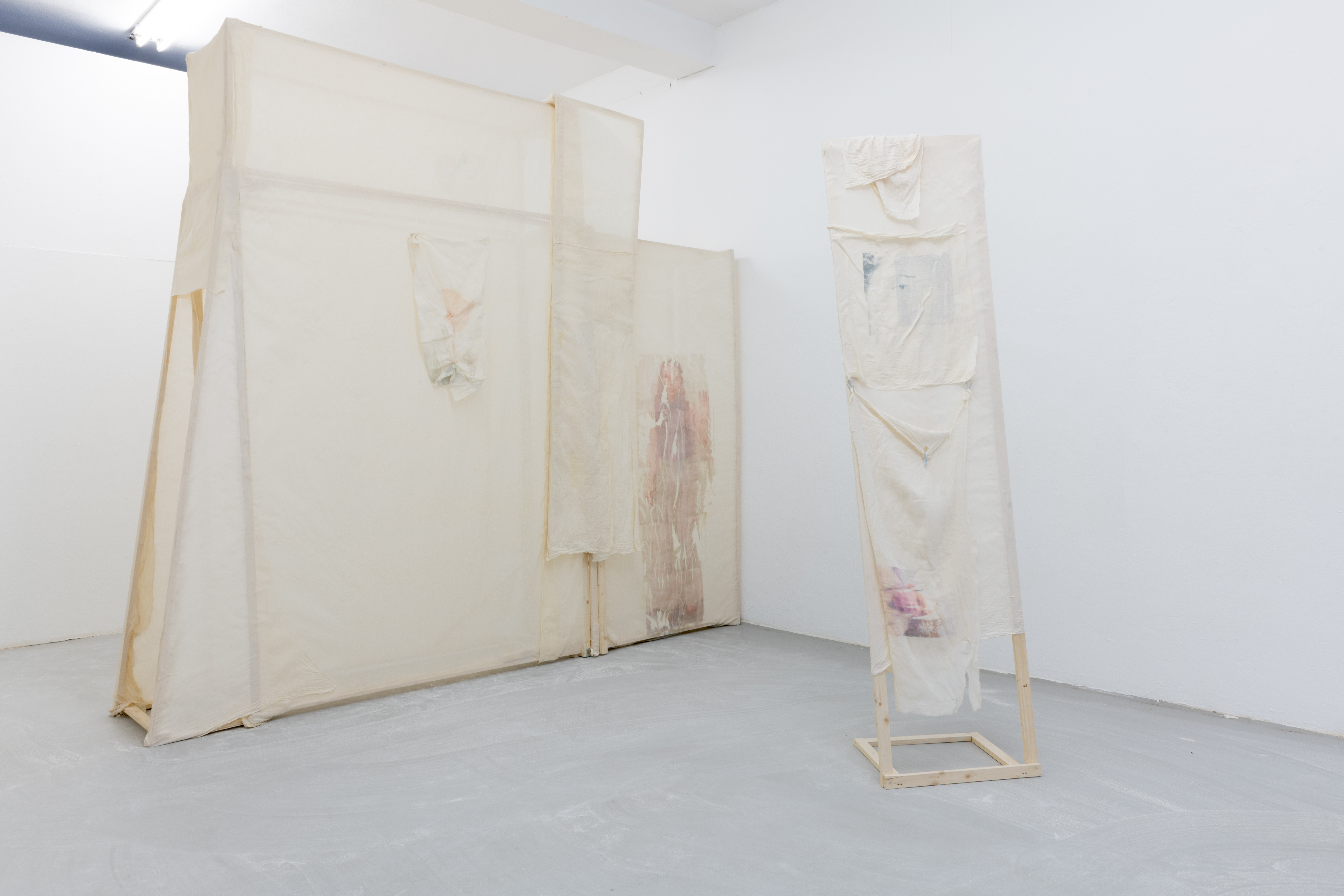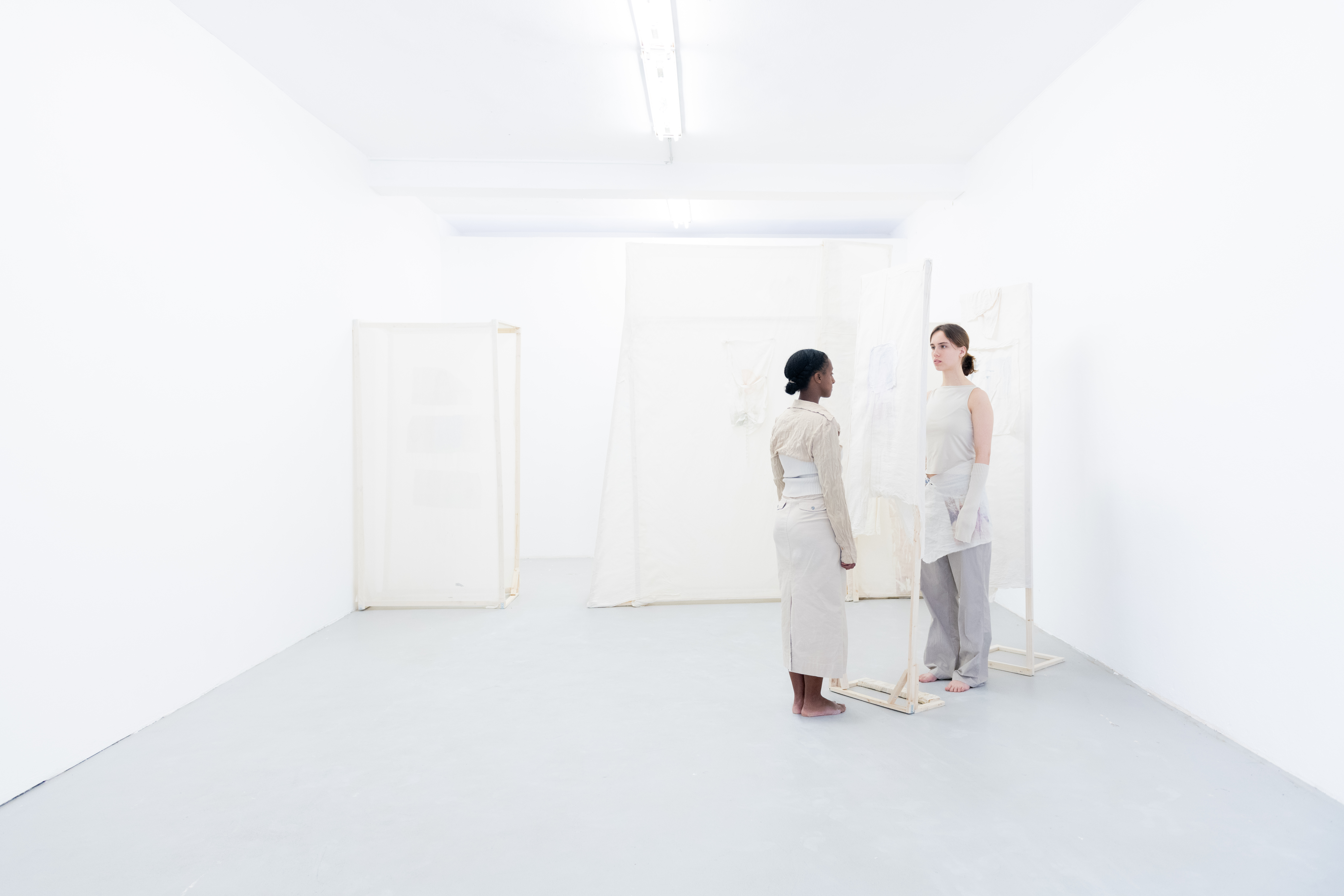 Shed-zone of the Unheard Question engages with themes of delineation and ambivalences of dependencies. Within the work sculptures merge with choreographic processes. Simple materials such as fragile wooden slats, transparent nettle fabric, and paper tissues transform into semi- transparent, soft, yet resilient walkable shelters for the performers. Transfer prints of body parts and persons lend vividness to the sculptures. Supported by one another and interconnected by crossbars, the sculptures may appear fragile and precarious, but they can continually rebalance themselves. This creates a play of fragility and robustness conceived to provoke questions about relationships of dependency and vulnerability. Certain elements on the sculptures can be detached and actively integrated into the performance, including two elements that transform from sculpture to clothing during the performance. The sculptures are modular and can be arranged freely in space, reflecting the engagement with performance art as a transformative, ephemeral medium in the character of the sculptures. The positioning of the plaster on the floor is also an element of the unfinished, simultaneously leaving traces on the floor, sculptures, and performers during the performance.